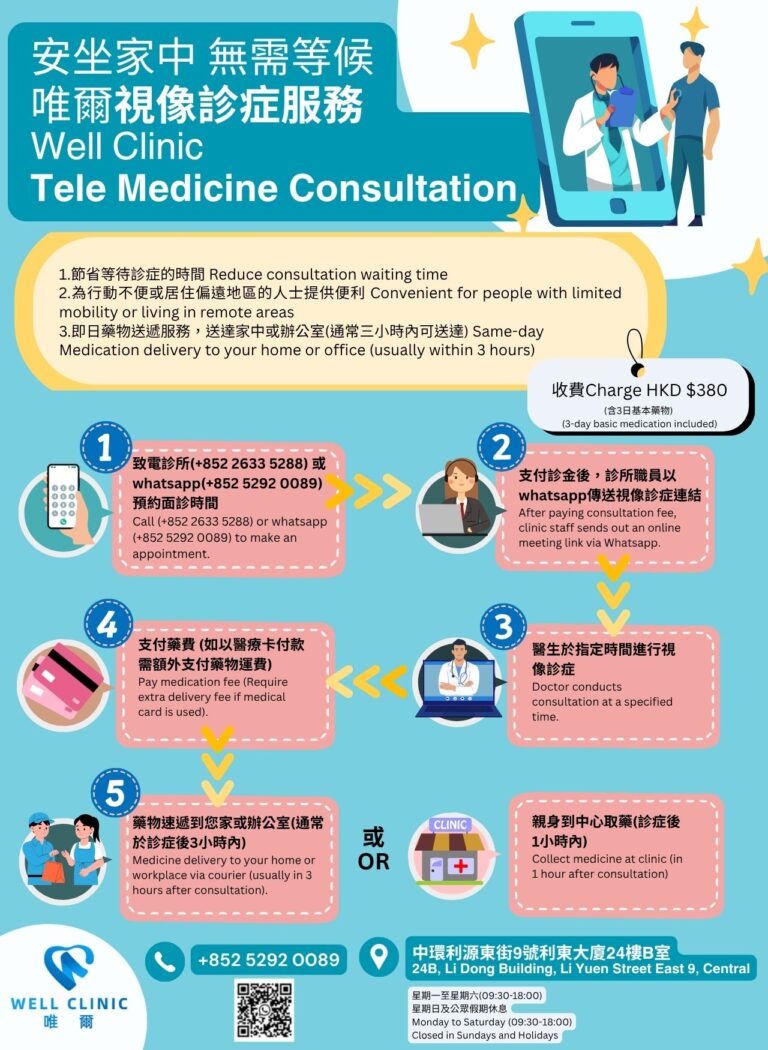 Telemedicine service is now available at Hong Kong Well Clinic . Patients may call to arrange a real-time consultation with a doctor, and can have medication delivered or picked up in person or by friends/family members.