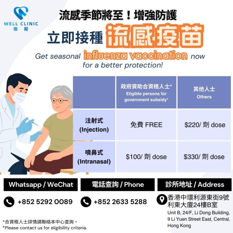 The 25/26 “Vaccination Subsidy Scheme” has been launched since 25 September 2025, and all eligible persons can receive the free injection under government subsidy. Well Clinic is being recognized by the Government to provide the service. As such, we will provide the free Seasonal Influenza Vaccine to eligible Hong Kong citizens, as to protect the public against the Seasonal Influenza Infection.